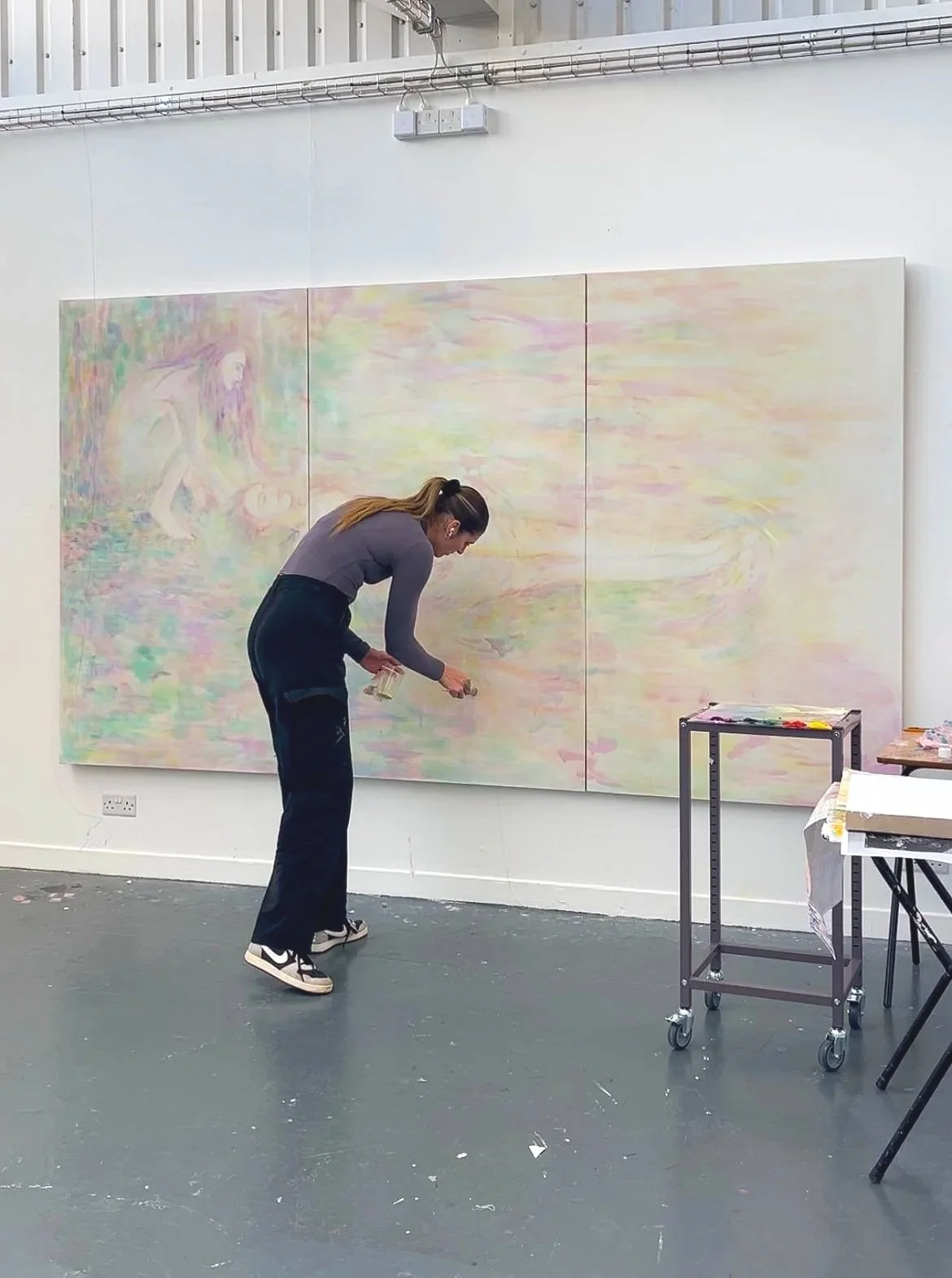 I am a female artist creating paintings that explore the body as a vessel for something greater, a physical container for the metaphysical. Working with oil paint thinned into semi-transparent layers onto linen, I use a vibrant dream-like colour palette to stain the surface and allow ghostly figures to slowly emerge and dissolve throughout the picture plane, by a process of layering gestural marks inspired by shapes, colours and textures found in the natural world. For me, nature provides a sanctuary that allows me to step out of a constant stream of thoughts and into the present moment. This connection to the natural world sits alongside my interest in spirituality, meditation, and my own lived experience, all of which inform an intuitive application of paint.